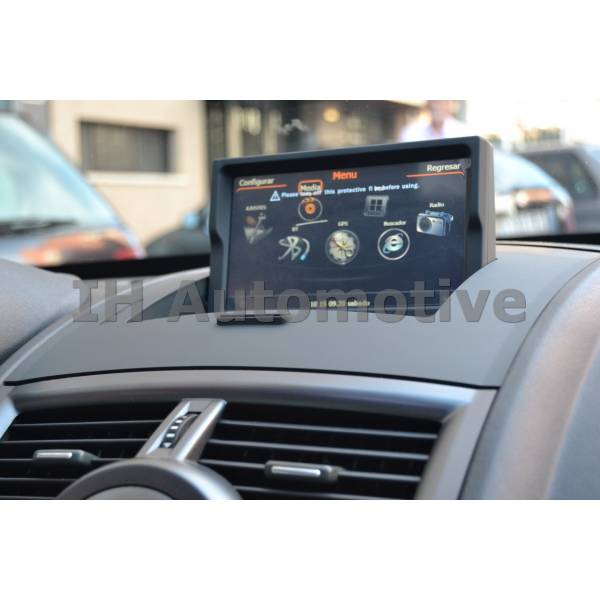 Modelo con adaptabilidad dimensional, tamaño y encaje específico. Con fijaciones y conexiones Plug&Play. Textura, tonalidad de color exterior e iluminación de botoneras acorde al salpicadero. Es un sistema bi modular compuesto por el módulo inferior y la moldura superior completa en color negro mate con la pantalla de 7" integrada.